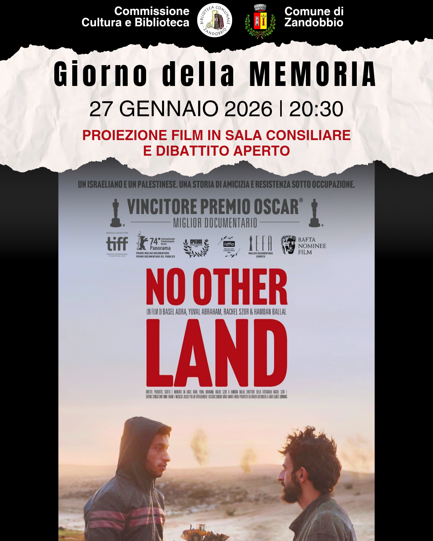 Proiezione film NO OTHER LAND in sala consiliare il 27 gennaio 2026 alle ore 20:30